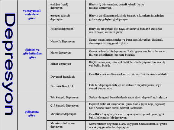 Depresyon genellikle sinsice gelişir. Depresyona girmiş insanlar çoğunlukla bunun farkına geç varırlar. Genellikle bu konuda temel bazı bilgileri edinmede yarar vardır. Depresyon hayatın karanlık kısmına aittir. Işığın bol olduğu ortamda onu görmek zordur.